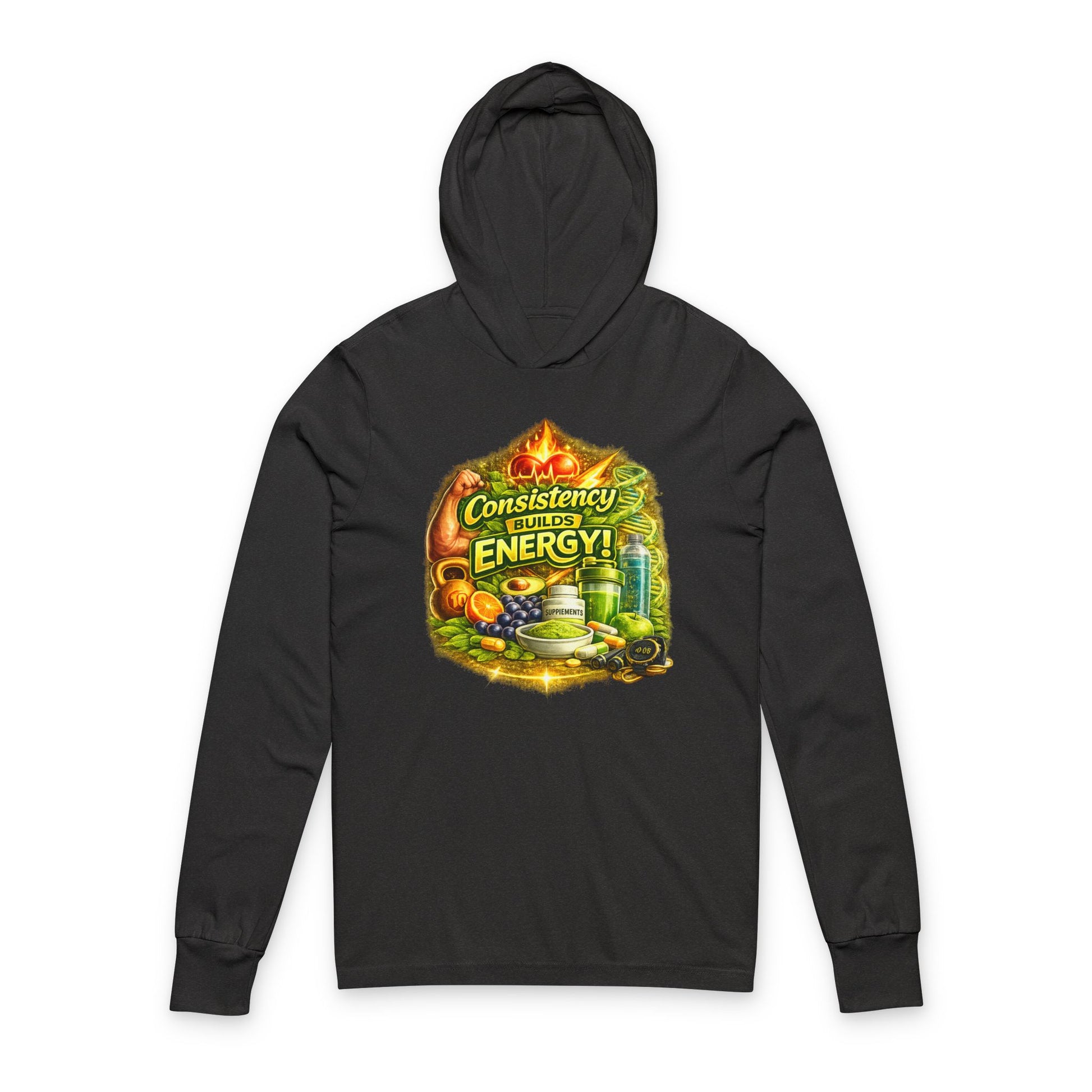 Hooded Long Sleeve Tee — “Consistency Builds Energy” Motivational Fitness Graphic